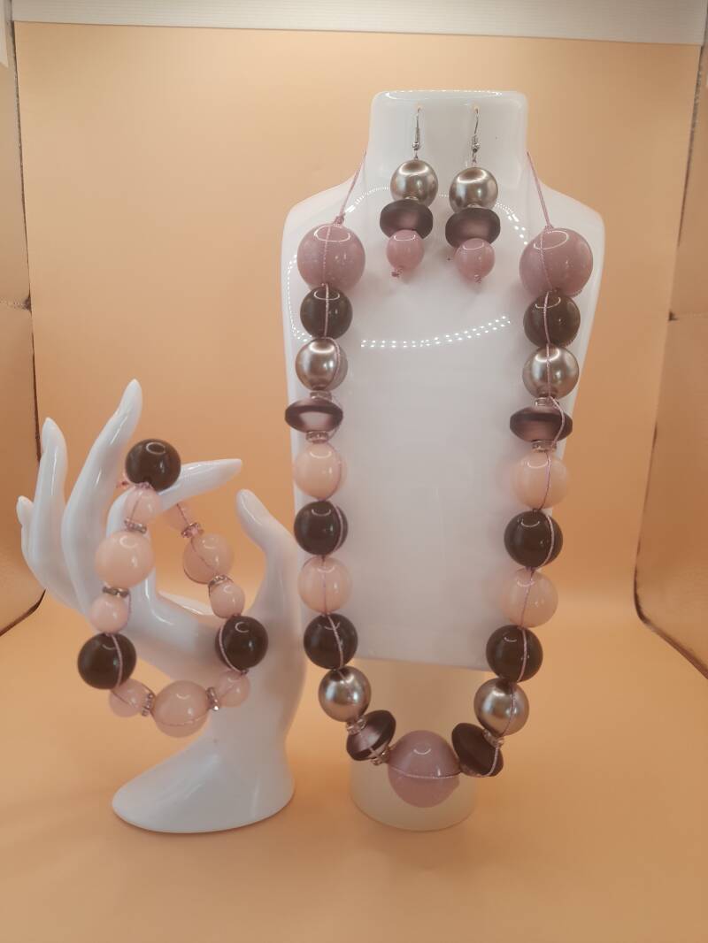 Een set met cerise acryl, keramiek en zilverkleurige- kralen